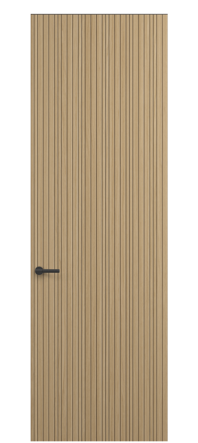 SELECT — коллекция минималистичных дверей с фрезеровкой по натуральному шпону. Рельеф на поверхности полотна создаёт игру света и тени, добавляя пространству динамичности и визуального объёма. Двери SELECT в сочетании со стеновыми панелями и мебельными фасадами, повторяющими лаконичный дизайн, создают единое стилевое решение.